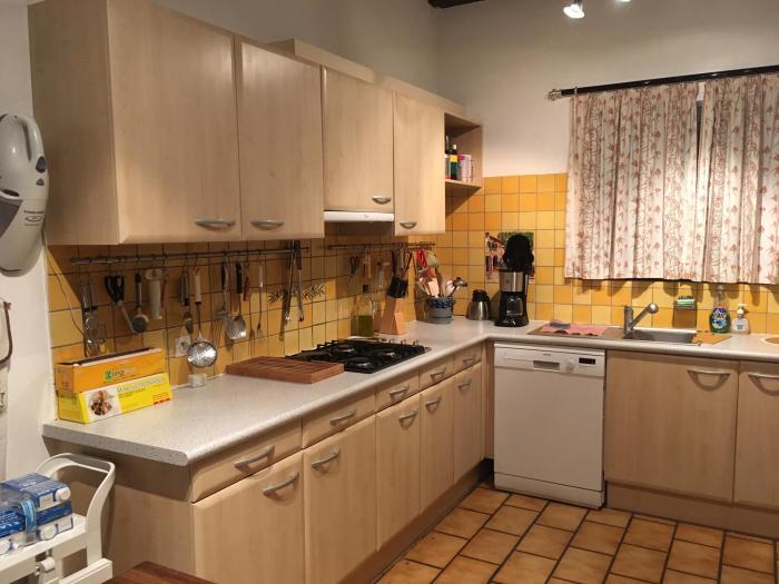 - Een open keuken uitgerust met vaatwasser, elektrische oven, magnetron, en inductiekookplaat, koelkast met vriesvak en diepvries (tafelmodel)